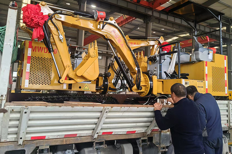 2024年11月16日,山东东达机电生产的两台小型挖掘机在机械设备生产车间装车发货。
